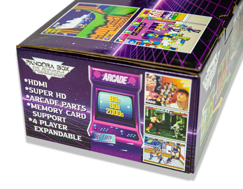 The official Pandora Arcade Platinum includes over 40 years of video games, including classic arcade games such as Donkey Kong, Space Invaders and Donkey Kong, to the latest games for PS1, Super Nintendo and Sega Genesis. It also contains Arcade Only Games, like The Simpsons Arcade and Xmen The Arcade Game, and even unreleased import Japanese and NEO Geo titles.